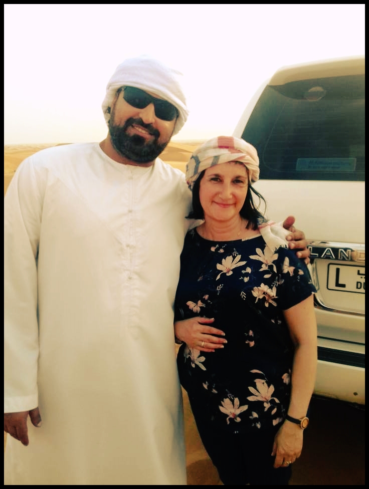 ruedas del 4x4 y nos coloca el "ghutrah" pañuelo árabe